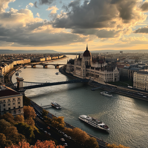 Budapest, Danube, Parliament, besides a new huge skyscraper --v 6.0 --s 250