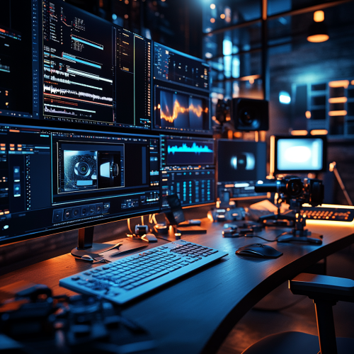 Generate a digital art for A digital art scene showing a professional coder in a futuristic office, surrounded by holographic screens displaying code. The atmosphere is dynamic and high-tech, emphasizing the lucrative and in-demand nature of programming skills. Use black color for the background and neon blue for the holographic screens. --ar 4:3