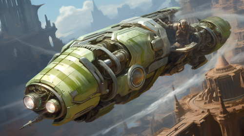 kaladesh, mtg inspired, large racing machine, long speeder, mechanical artifact, light green and silver, lots of space, massive war engine, action shot --ar 16:9 --no people, animals