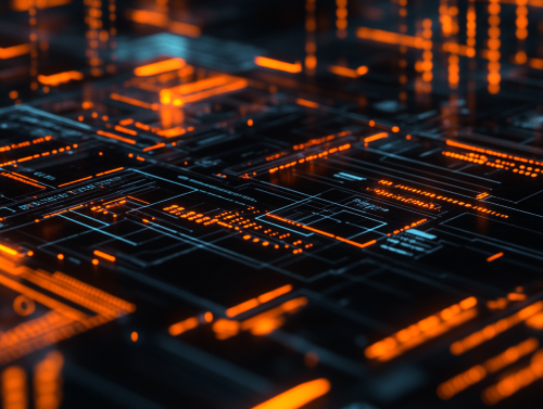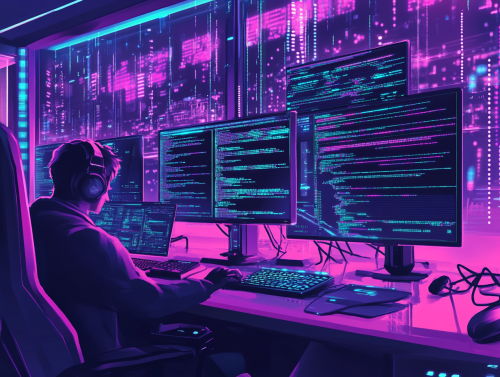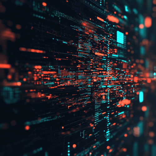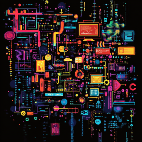 Generate a digital art for A digital art representation of a futuristic resume with top programming skills for 2024. The scene includes abstract elements like code snippets, algorithmic patterns, and tech icons. The background is predominantly black with accents of neon colors, creating a modern and high-tech atmosphere. No text is written on the background. --ar 1:1