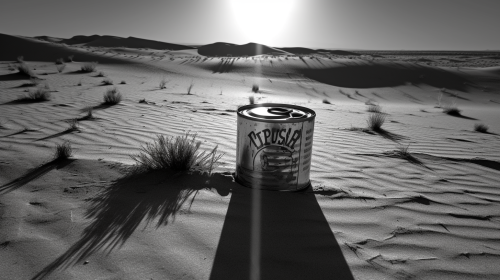 Antique soup can with signs of oxidation, half-submerged in desert sands, medium: photography, style: vintage black and white reminiscent of the 1950s, lighting: elongated shadows from the setting sun, colors: deep blacks and bright whites, composition: Canon EOS 5D Mark IV DSLR camera, EF 50mm f/1.8 STM lens, Resolution 30.4 megapixels, ISO sensitivity: 100, Shutter speed 1/160 second, f/8, sharp focus, high contrast, intricately detailed --ar 16:9 --v 5.1 --style raw --s 750.