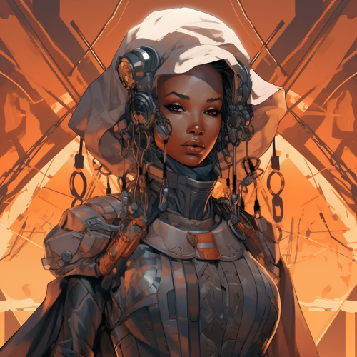 a photorealistic portrait of a mature woman from a futuristic Sci-Fi setting. She has orange skin, long white hair and pupilless white eyes. She wears a yellow robe with the hood pulled down and is standing on the bridge of her personal ship. --ar 2:3 --v 6.1