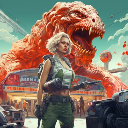 a sci-fi futuristic gas station with a giant monster representing extremely high gas prices. A woman holding a big gun and looking outraged.