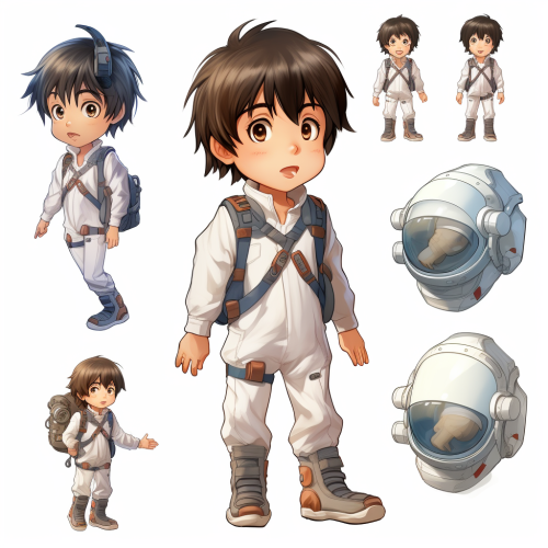 5 year old little boy with dark hair, dressed like an astronaut, with a futuristic laser gun and a backpack, full of bravery and sense of adventure, character sheet, multiple angles, studio ghibli animation