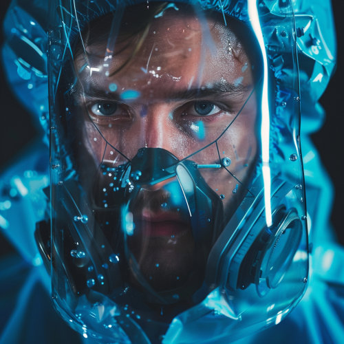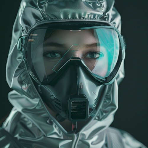 close up portrait highly advanced dystopian world, transparent high tech hazmat gear --v 6.0