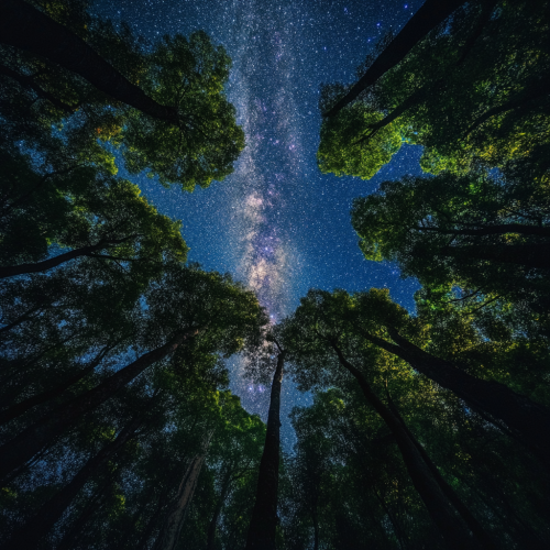 Real photos in the Asian forest, taken from a low angle, looking up to see the Milky Way. The images are sharp and realistic, with excellent details that look real --ar 16:9