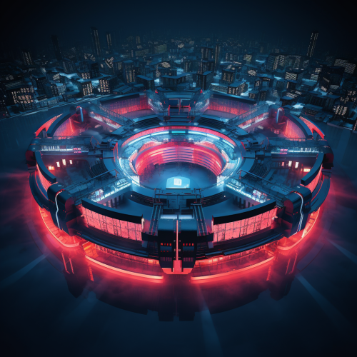 birds eye veiw of a futureistic circular stadium, neon cyan and neon red