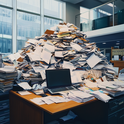 A large office space with a cluttered desk in the foreground, covered with a chaotic stack of papers, documents, and folders in complete disarray. A computer sits on the desk, partially obscured by the excessive amount of scattered sheets. The overall scene should convey a strong sense of overwhelming tasks and pending work. The view is directly facing the desk, creating a front-facing perspective. The background features office furniture and details that complement the busy atmosphere without detracting focus from the desk. The image should be in vertical format, perfect for Instagram stories, with hyper-realistic lighting and attention to detail, capturing the feeling of a stressful work environment