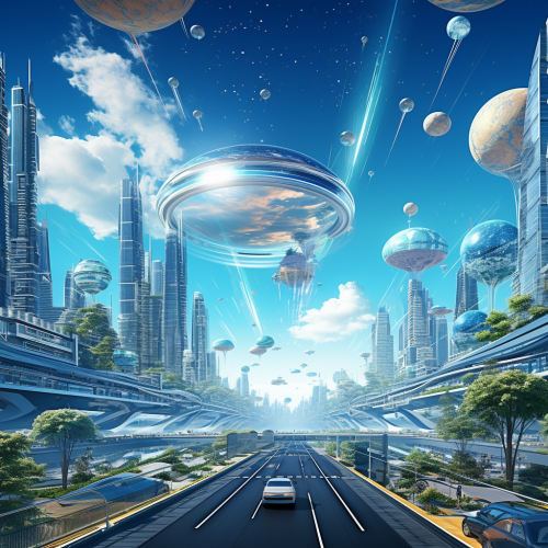 futuristic city, roads, flying cars, futurology, blue sky, psychadelic --v 5.1 --ar 16:9