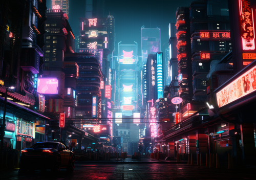 futuristic cityscape with gleaming skyscrapers, elevated highways, and flying vehicles crisscrossing the skyline. Neon lights and holograms highlight the city's advanced technology. --ar 9921:5197