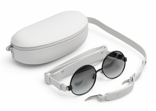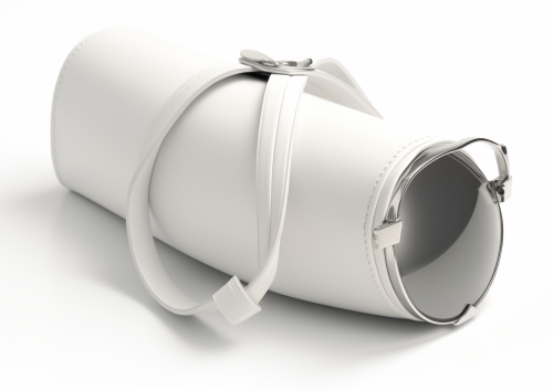 A stunning full-metal glasses case that combines futuristic and classic elements. Elegant and all in white. A detachable strap that can be used as an accessory. Futuristic details. --ar 7:5 --v 5.0