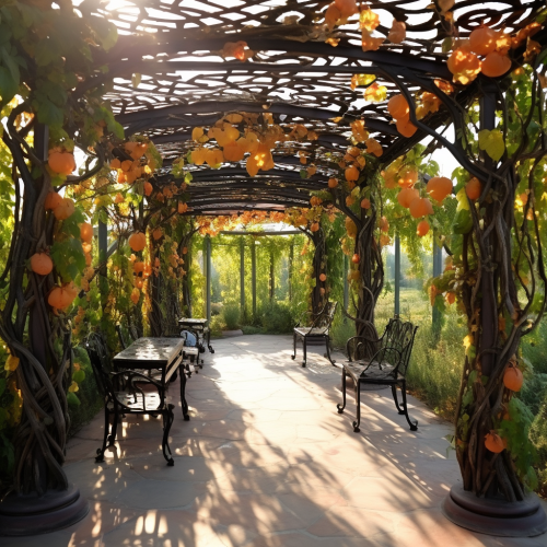 A aluminium pergola with motorized and light siystem Medium: Photograph, focusing on capturing the details and ambiance of the pergola. Environment: Outdoors, nestled in a lush garden or backyard, surrounded by vibrant greenery and colorful flowers. Lighting: Soft, golden-hour sunlight filtering through the lattice roof, casting delicate shadows on the ground below. Color: Warm and inviting tones, emphasizing the natural aluminium of the pergola and the vibrant colors of the surrounding flora. Mood: Tranquil and serene, evoking a sense of relaxation and peacefulness. Composition: Wide-angle shot capturing the entire pergola structure, with leading lines drawing the viewer's eye through the scene.