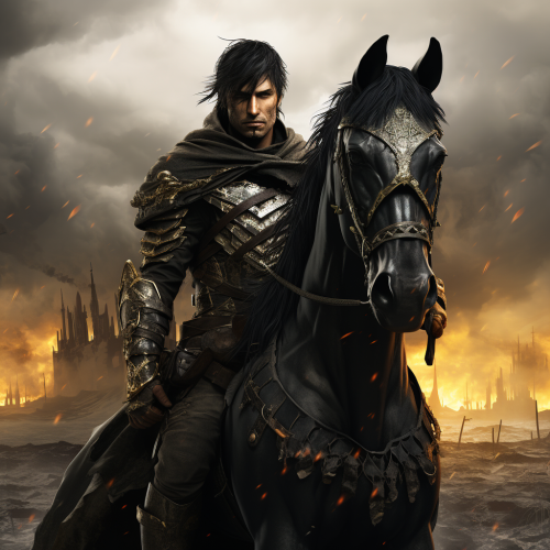 hyper-realistic high deffinition image of male Wander from Shadow Of The Colossus wearing black leather amour with gold fabric. Riding an all black horse with a white spot on its forehead. Dark, scary, in the style of a mortal kombat X character. background is black smoke.