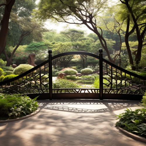 A flat, matte black metal fence with thin bars composed of several overlapping nested arches of different sizes. A pleasant zen garden can be seen beyond. View from front.