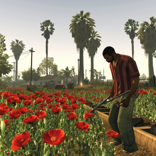 gameplay screenshot of Grand Theft Auto: San Andreas, player character is farming a garden of poppy flowers --v 6.0 --style raw --s 50