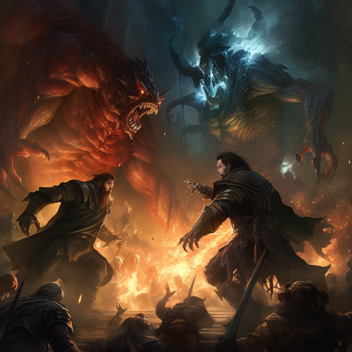 a large orc holding a man in a headlock, d&d 5e, dark fantasy, epic, full body shot, action shot, night, 4k, vivid, 4k ultra detailed, 4k cinematic, 4k hyper detailed, 4k ultra realistic, 4k hyper realistic, 4k photorealistic, --ar 16:9 --v 6.1