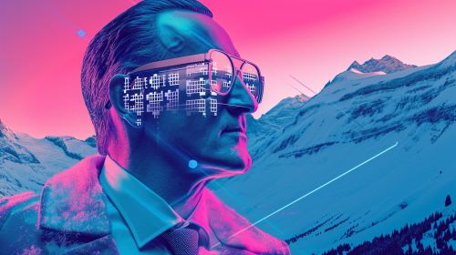 an award winning poster of davos in winter during sunset with a very attractive asian business man with extremly extrovert exaggerated oversized wild sunglasses, the sunglasses act as a mirror they display a futuristic datastream of financial data, retro style 20s style graphics, pink and blue --ar 16:9 --v 6.0