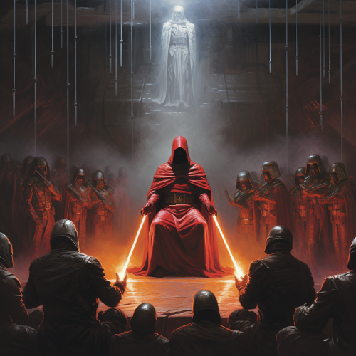A scene in a Star Wars like industrial setting where the Emperor has lightning coming out of his fingertips and is electricuting a single red imperial guard who is on his knees but still in defiance.