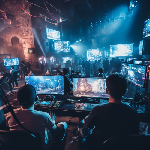 give me a photo where there are gamers playing game on a lan where fans are playing game