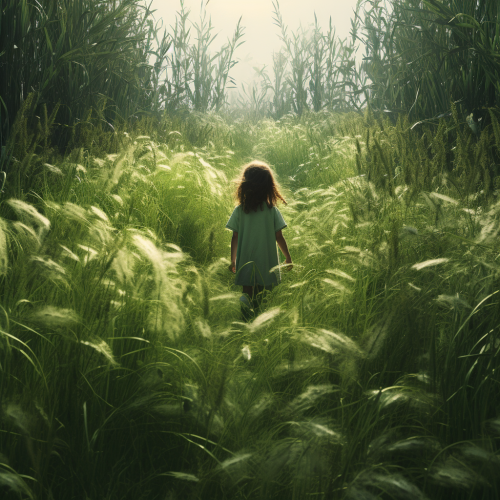 a meadow with blades of grass as big as trees in the middle a tiny little girl