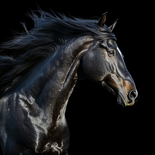 Black horse rises into the air to the right side, mane developing in the wind, the horse in all the pictures, on a dark black background with no extra effects, epic photo, hyperrealistic photo --ar 16:9 --v 6.1