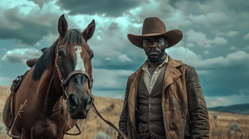 Full body portrait photo of a tough cowboy woman with long blonde hair standing beside her beautiful brown horse, classic vintage style , 1960s, photo taken at a traditional equestrian ranch, sunlight is almost blinding, editorial photography, emotional art, shapes are fluid and undefined, high definition digital art, negative color, a mix of pastel colors and neon, a poetic and creative perspective, inspired by Man Ray's visionary photography, large-screen camera, photo art that is also inspired by digital art, cold color scale with hints of flickering neon, --ar 5:4 --p 6s1y8tz