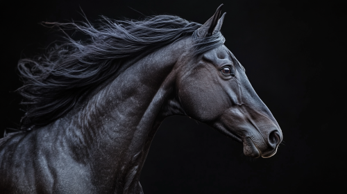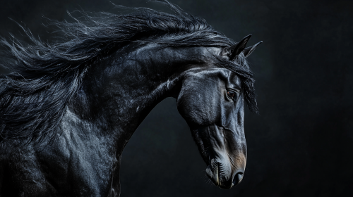 Black horse rises into the air to the right side, mane developing in the wind, on a dark black background with no extra effects, epic photo, hyperrealistic photo, 32k UHD --ar 16:9 --quality 2 --v 6.1