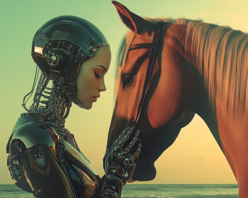 a beautiful robotic woman watching a beautiful brown horse by the sea , contemplating the choices she has made, she has a light makeup, emotional art, bright colors, negative colors, shapes are fluid and undefined, high definition digital art, negative color, a mix of pastel colors and neon, a poetic and creative perspective, inspired by Man Ray's visionary photography, large-screen camera, photo art that is also inspired by digital art, cold color scale with hints of flickering neon, --ar 5:4 --p 6s1y8tz