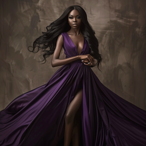 close realistic photo of a beautiful African American woman, standing with a long purple luxurious dress, with hand on leg, long black beautiful hair,