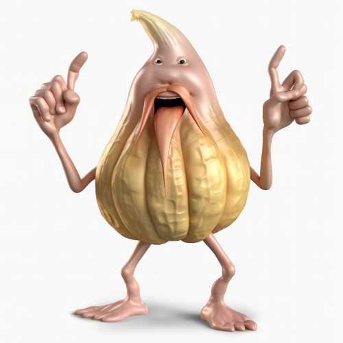 A 3D cartoon garlic clove with arms and legs, whistling. Transparent background.