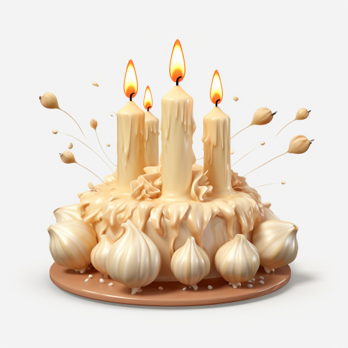 A high quality 3D cartoon of Garlic blowing out candles. Transparent background.
