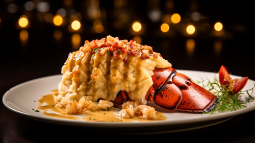 The finest lobster tail on the market, poached in a nutty brown butter and served with a decadent symphony of roasted hazelnuts and a side of whipped brown butter-infused mashed potatoes. highest quality image resolution, served on a plate with gilded gold accents, golden lighting --ar 16:9