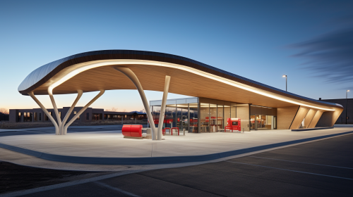 An architectural awarded gas station design, very sofisticated and modern, located in a highway in wyoming. daylight. Composition: Sony Alpha 1 DSLR camera, 24mm f/2.8 STM lens, Resolution 30.4 megapixels, ISO sensitivity: 640, Shutter speed 1/150 second, mid-shot --style raw --ar 16:9