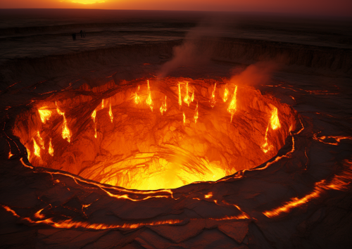 PhotoReal,hyper quality,highly detailed,elaborate,Unreal,Sun,Vast,Spectacular,Burning Fire,Gates of Hell / Turkmenistan, Turkmenistan, located in southwestern Central Asia, is a country where 85% of the land is desert, and it is still a country of many mysteries. Since gaining independence from the Soviet Union, Turkmenistan has been governed by a near-dictatorial regime that also controls speech. However, it is a safe country and rich in natural gas. In the city of Darvaza, Turkmenistan, there is a large pit called the Gates of Hell. The huge hole created by a drilling accident constantly spewed out gas, which had to be ignited in order to stop it. However, it is unknown how much natural gas is in the hole and how long it will continue to burn, so the hole looks just like a gate to hell. As we continue onward through the desert, we can vaguely make out the orange color of the flames. Soon it turns into a roar and a hot wind. And when they see the gates of hell opening at their feet, they feel as if they are at the end of the world. Although it was created by an accident, this is the only place that offers a spectacular view of the flames that are still burning. --ar 7:5