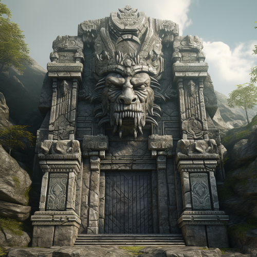 Entrance to the dwarven fortress that is the face of a bearded dwarf with helmet and gaping mouth serving as the entrance, carved like a high relief on the side of a mountain, with the double-winged gateway knocked down to the ground inward. The style should be Old-School Essentials, simple lines, few details.