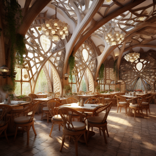realistic photo of a cozy restaurant made in the architectural style of Gaudi