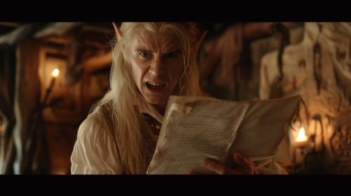 dynamic photoRealistic movie still extreme close up of an elven eladrin pale gaunt young male cleric gritting his teeth in anger and frustrattion with a small piece of parchment in his hand in a room in a medieval inn, pointy elven ears, Blonde long hair, fine Elizabethan clothing, warm lantern lighting, cinematic lighting --ar 16:9 --v 6.0