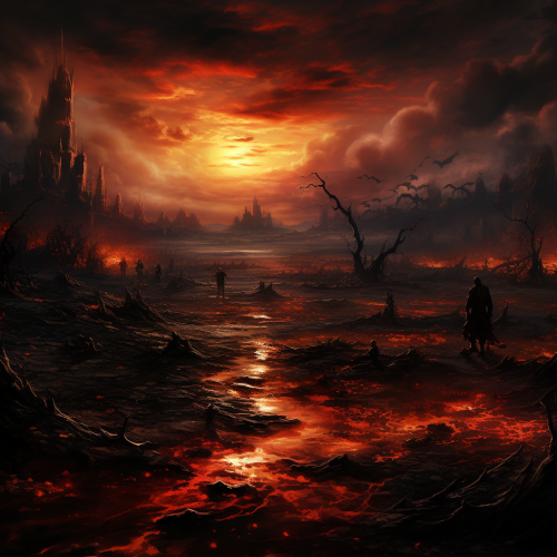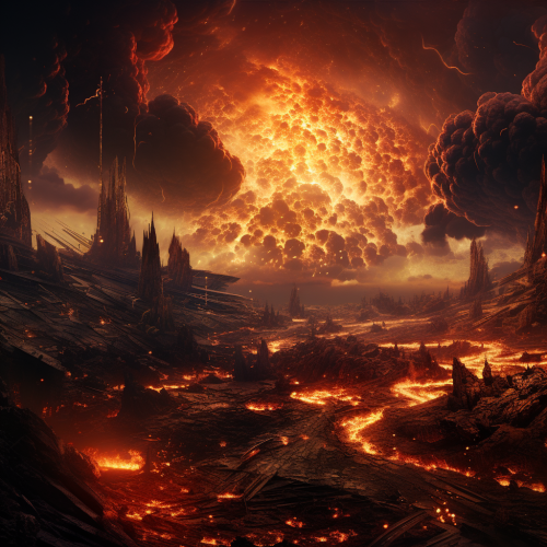 Fantasy art, With a deafening roar, the sky split asunder, and torrents of searing flames descended upon the city like a merciless rain of wrath. Buildings crumbled, streets turned to rivers of molten stone, and the once-vibrant metropolis was engulfed in an inferno of unparalleled ferocity.