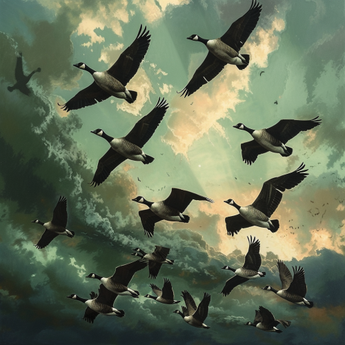 a flock of Canada geese dawn north and paint the sky green-black with the creaks of their wings --v 6.0