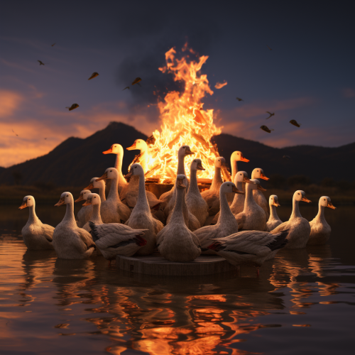 Three geese observing dragon in flight
