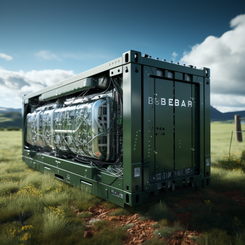 Create a photo-realistic 4K image of a BESS (Battery Energy Storage System) that resembles a shipping container, set within a lush green pastoral Australian dairy farm landscape as if shot with a state-of-the-art film camera. The battery system, crafted like a shipping container, should be seamlessly integrated amidst grazing cows, pristine pastures, and typical farm infrastructure. The backdrop should showcase tall eucalyptus trees, undulating green fields, and a vibrant blue sky. The image's quality, detail, and lighting should emulate the characteristics and intricacy of a high-end film camera capture, especially with a focus on early morning lighting nuances --s 750