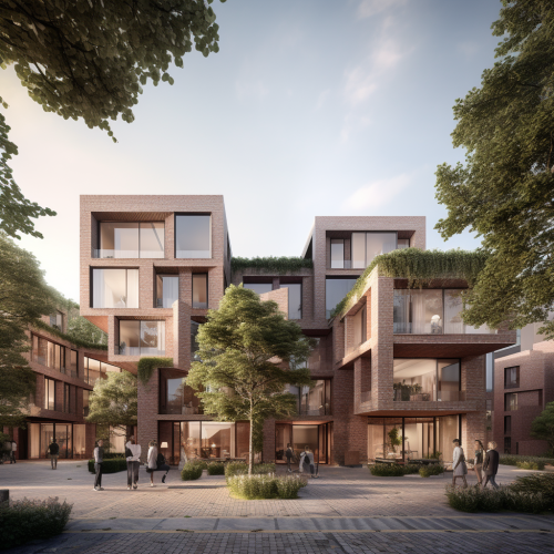 a contemporary residential complex characterized by modern, geometric architecture. Envision a series of townhouses made with light-colored brick facades. Introduce a textured design by adding sections with a three-dimensional, basketweave brick pattern for depth. Focus on large, floor-to-ceiling windows framed by dark materials to contrast with the light bricks. Include balconies and terraces with simple metal railings. Design entryways marked by glass doors, accentuated with dark frames to demarcate the transition from outside to inside. Surround the buildings with lush, diverse landscaping, integrating a variety of plants, shrubs, and mature trees. Incorporate paved pedestrian pathways, hinting at a walkable, community-friendly environment. Add elements indicating eco-friendly living, like bicycles and green spaces. Ensure the lighting in the scene mimics a natural, warm daylight atmosphere, highlighting the buildings' design features and the landscaping's vibrant colors.