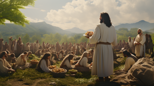 Jesus surrounded by a crowd in a rural setting, with baskets of bread and fish miraculously multiplying to feed the hungry multitude. scene with green hills, trees, and a crowd dressed in period attire. cinematic photoshoot, high detail, hyper realism 8k. --ar 16:9