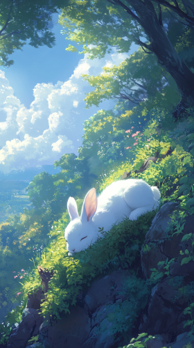 A white rabbit is curled up and sleeping among the trees near the top of a high mountain. Surrounding it are dense clusters of deep green shrubs, and a crystal-clear blue sky stretches above, vividly contrasting with the natural landscape. The sunlight filters through the clear air, sparkling as it reflects off the grass and leaves, casting a warm glow on the rabbit's soft white fur. As the breeze stirs, the trees sway realistically, and the subtle sounds of nature can be faintly heard. The scene is dreamlike, yet it captures the real beauty and vividness of nature, inspired by Makoto Shinkai's style, with intricate details, even more vibrant and bright colors, and a sense of wonder. --ar 9:16 --v 6.1