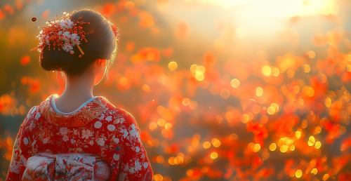 a geisha in the tokogawa era doing a business crypto presentation with a kimono at tokyo with all in gradient colors gold to yellow, also she her kimono its a 22 Century Crypto all over design style --ar 365:188 --s 750