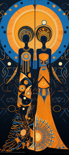 black woman zodaic sign Gemini in the style of a traditional tattoo in a cirkel with blue and orange colors and a white background