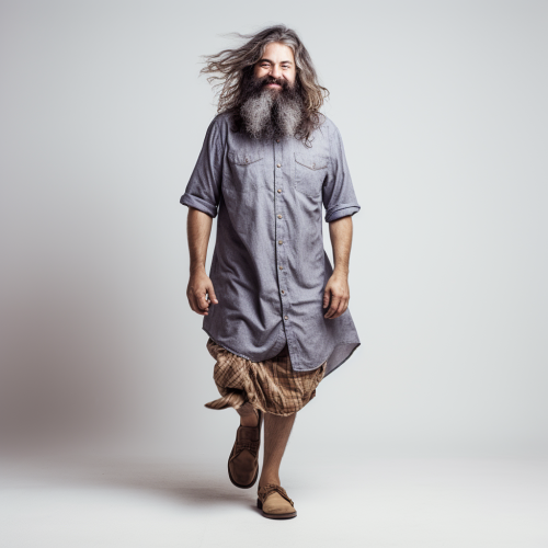 40 year old dad, beard, burly man in a dress and wig walking towards the camera, white background, photo realistic, commerical photography