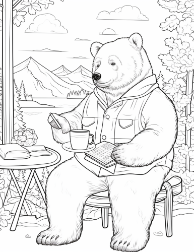 bear drinking coffee. Vector art, coloring book, thick lines, clipart, 16 bit color --ar 17:22