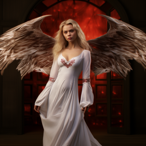 magic rebecca romijn white dress with red wings in style of Vampire the Masquerade Tuatha De Danann chirch background