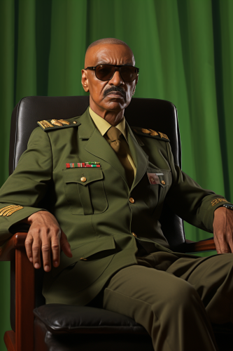 serious portrait, african male man, dictator, age 60, real, shaved hair, small square black moustache, golden sunglasses square thin frame, serious face, green military costume high grade general, background office president, sitting on chair, hands on desk, photorealism, photo realistic, ultra detail, 100mm, f 1.2 --ar 6:9